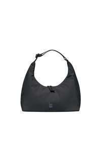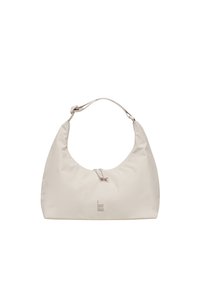 Vrouw draagt een witte coltrui en grijze jeans, glimlachend, met een zwarte schoudertas met het label "GOT BAG" op haar rechter schouder.