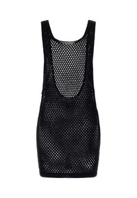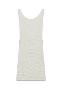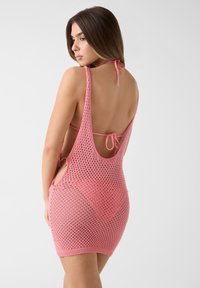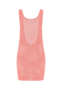 Jonge vrouw met lang haar staat zelfverzekerd terwijl ze een mouwloze roze gehaakte mini-jurk draagt over een badpak en beige sandalen met hoge hakken.