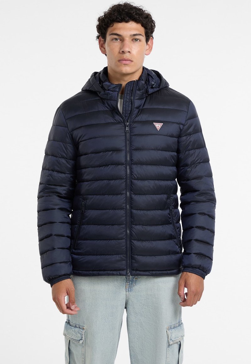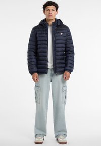 Jonge man die een marineblauwe gewatteerde jas met capuchon en lichtblauwe cargobroek draagt, staand tegen een effen witte achtergrond.