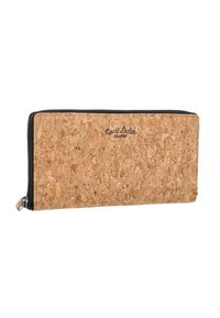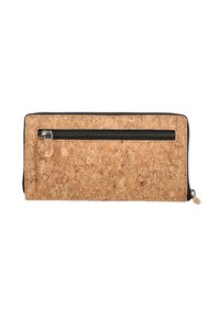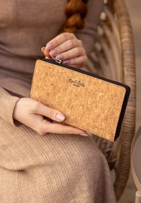 Kurkportemonnee met een gestructureerd oppervlak, ritsluiting en zwarte afwerking. Bedrukt logo aan de voorkant, vastgehouden tegen een geribbeld stoffen achtergrond.