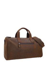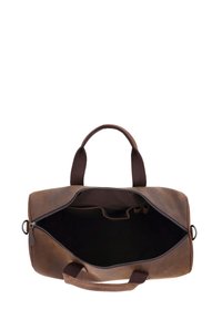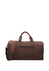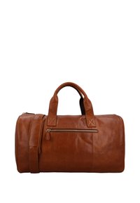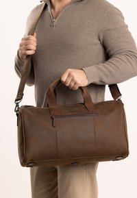 Bruine leren duffeltas met dubbele handvatten en een afneembare schouderriem. Heeft een voorvak met rits en met klinknagels versterkte accenten aan de onderzijde.