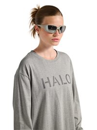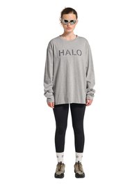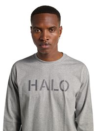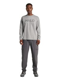 Man draagt een grijs shirt met lange mouwen met de tekst "HALO", donkergrijze cargobroek en zwart-grijze wandelschoenen, staand met het gezicht naar voren.