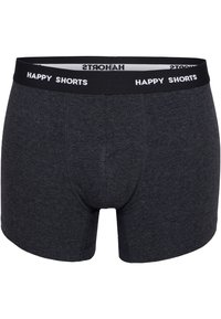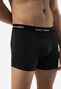Zwarte boxershorts met een grijze tailleband met de tekst "HAPPY SHORTS". Zachte stof, aansluitend ontwerp en gladde textuur.
