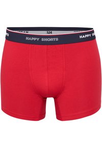 Drie paar boxershorts: één rode, één donkerblauwe en één grijze met witte strepen. Elke heeft een zwarte band met het label "HAPPY SHORTS."