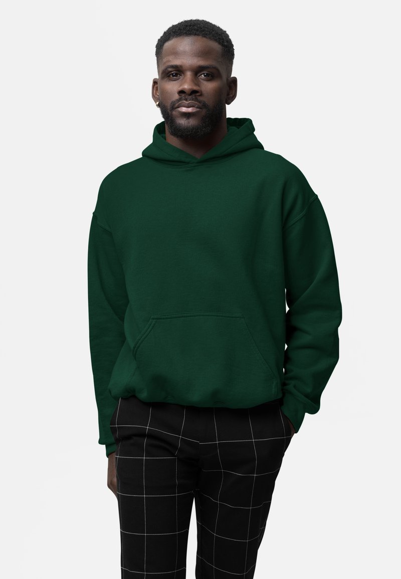 Man draagt een donkergroene hoodie en zwarte broek met witte rasterlijnen, staat met één hand in zijn zak tegen een effen achtergrond.