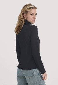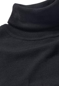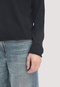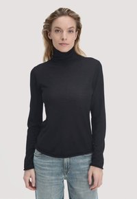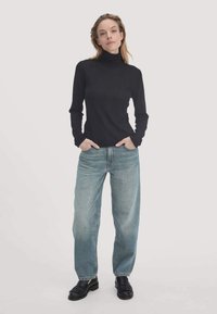 Vrouw met een lichte huid en blond haar, gekleed in een zwarte coltrui en blauwe jeans, staande tegen een effen lichte achtergrond.