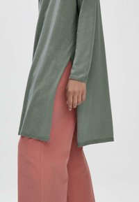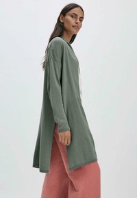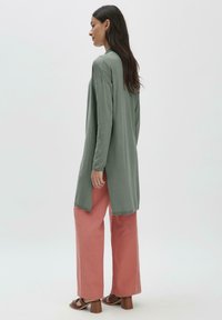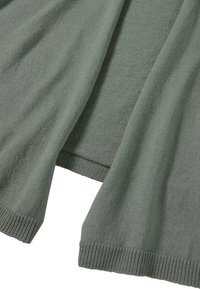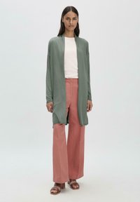 Lange, open voorkant cardigan van groene stof, gecombineerd met lichtroze wijde broek. Eenvoudig wit shirt eronder, platte bruine sandalen.
