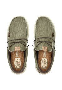 Casual donkergroene canvas loafer met bruine accenten, moc-toe stiksels, veterdetails en witte rubberen zool.