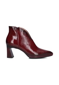 Bronzen leren enkelboot met een spitse neus, een gestructureerde afwerking en een gestapelde blokhak. Gladde, stijlvol ontwerp met minimale accenten.