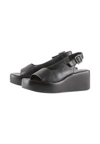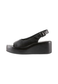 Zwarte platform slingback sandaal met open teen en verstelbare gesp, voorzien van een dikke zool en een glad lederen afwerking.