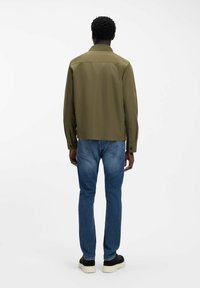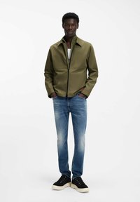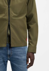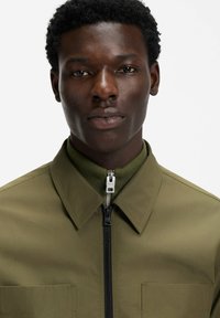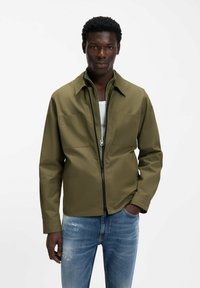 Olijfgroene jas met een ritssluiting, twee borstzakken en een gestructureerde kraag. Gemaakt van glad, duurzaam materiaal; nauwsluitend ontwerp.