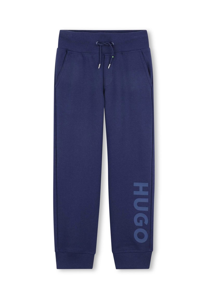 Navyblauwe trainingsbroek met een elastische tailleband, trekkoord, zijzakken en "HUGO" in grote letters gedrukt op het linkerpantalon.