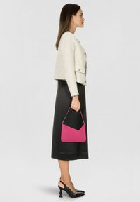 Vrouw in witte, getextureerde jas, zwarte midirok, zwarte hakken, houdt een kleine felroze handtas vast tegen een effen lichte achtergrond, kijkt naar rechts.