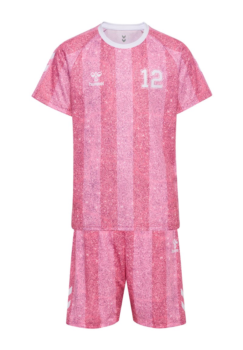Roze sportshirt en korte broek met een gestructureerd patroon, witte kraag, nummer 12 op de borst en witte merkemblemen op shirt en broek.