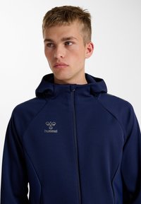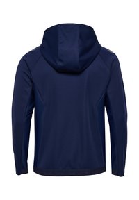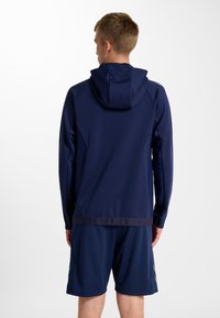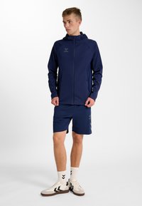 Jonge man die een marineblauwe capuchonvest met rits en bijpassende korte broek draagt, staand tegen een effen witte achtergrond.