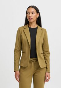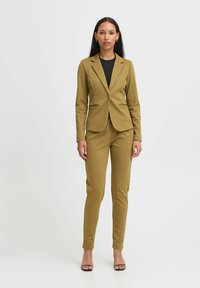 Vrouw draagt mosterdgele blazer en bijpassende broek over een zwarte top, staand tegen een effen lichte achtergrond, kijkt opzij.