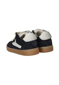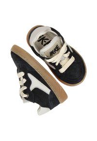 Marine blauwe suède sneaker met witte leren accenten, crème veters en een rubberen gum zool. Beschikt over een ronde neus en contrasterend zijontwerp.