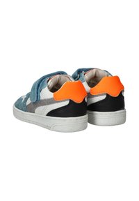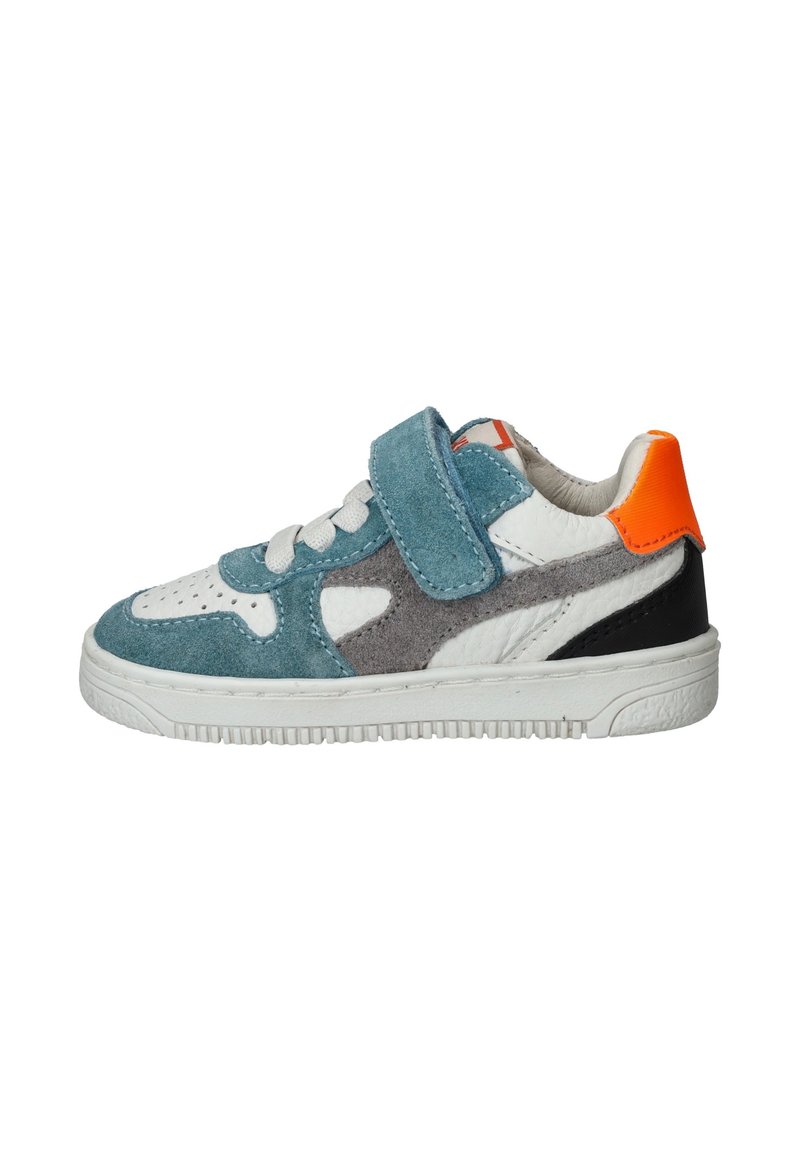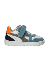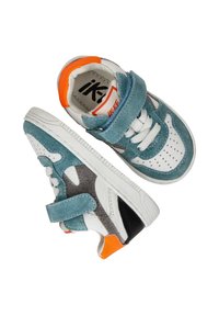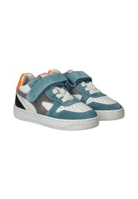 Sneaker met een mix van teal suede, grijze suede en witte leer. Heeft een klittenbandsluiting, witte zool en een oranje accent bij de hak.