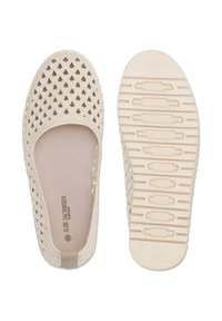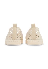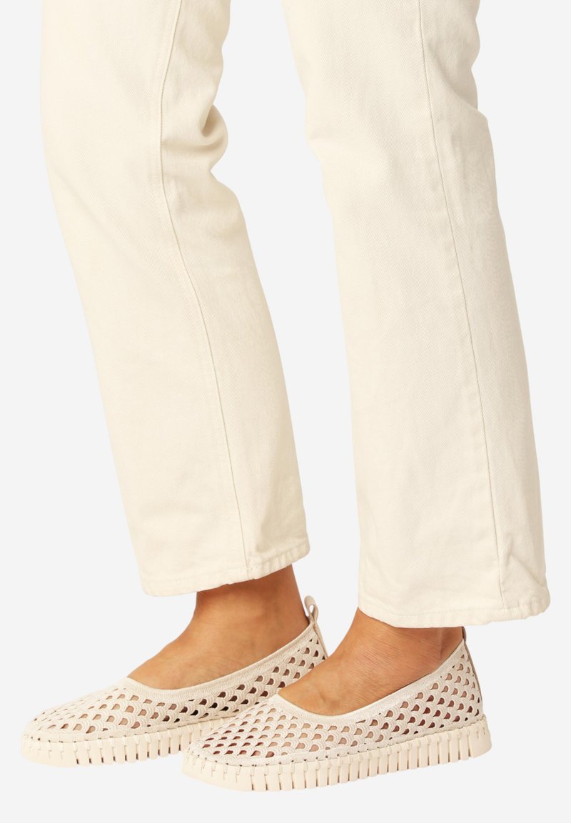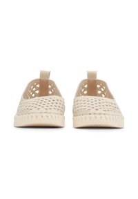 Voeten met beige geweven instapschoenen gecombineerd met off-white rechte broeken tegen een effen achtergrond.