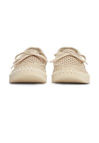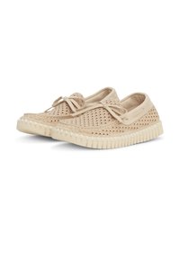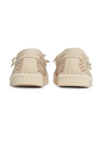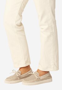 Persoon die crèmekleurige wijde broek en beige geweven instapschoenen met decoratieve strikdetails draagt, staand tegen een witte achtergrond.