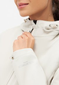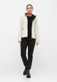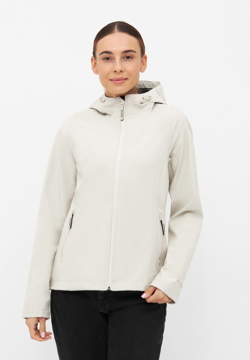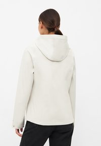 Lichtbeige jas met capuchon, volledige ritssluiting, twee zijzakken en elastische manchetten. Gladde, licht getextureerde stof.