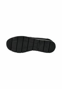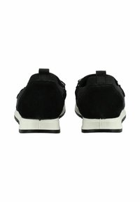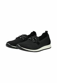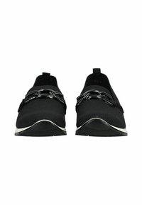 Zwarte instapsneaker met gebreide bovenkant, decoratieve gesp, wit zool en getextureerde zwarte buitenzool, zijaanzicht naar links gericht.