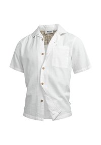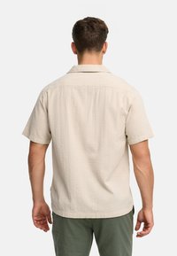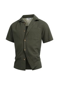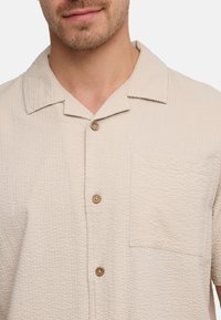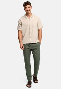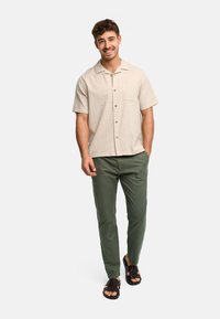 Man draagt een beige kortarmig getextureerd overhemd met knopen en een borstzak, gecombineerd met olijfgroene broek, tegen een effen achtergrond.