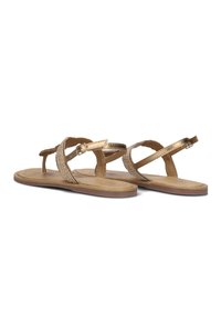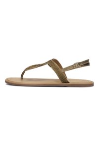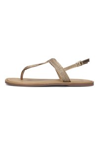 Goudkleurige platte teenslippers met geweven banden, verstelbare enkelgesp en een gladde beige voetbed. Minimalistisch ontwerp met een platte zool.