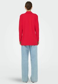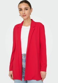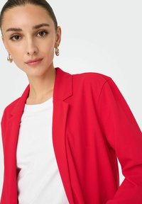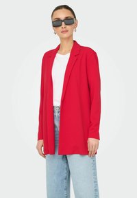 Rode blazer, lange mouwen, open voorkant ontwerp, lichtgewicht materiaal. Gecombineerd met een wit T-shirt en lichtblauwe jeans. Zwarte zonnebril gedragen.