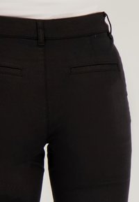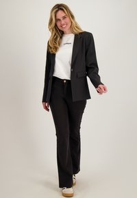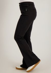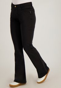 Persoon draagt zwarte bootcutbroek en witte sneakers met rubberen zolen, staand tegen een effen lichte achtergrond.