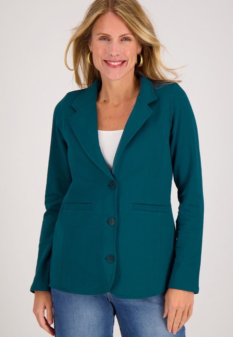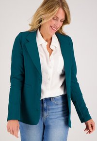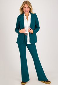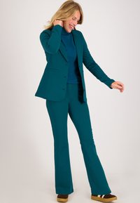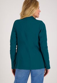 Teal, getailleerde blazer met een reverskraag, vier knopen, voorzakken en subtiele stiksels. Gladde stof, lange mouwen.
