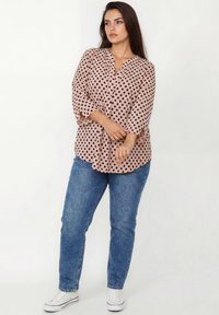Vrouw draagt een lichtroze blouse met zwarte polkadots en driekwart mouwen, gecombineerd met een blauwe spijkerbroek, staand tegen een effen achtergrond.