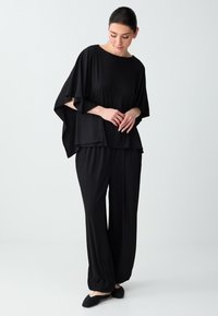 Vrouw met donker haar in een loszittende, zwarte, kortermige top met textuur en bijpassende wijde broek, staand tegen een effen lichte achtergrond.