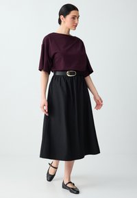 Vrouw draagt een donkerpaars loszittend topje met mouwen tot de ellebogen, een zwarte rok en een zwarte riem met een gouden ovale gesp.