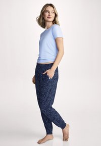 Vrouw draagt marineblauwe joggerbroek met lichtblauwe, gestippelde krulpatronen en elastische tailleband, staat blootsvoets met één hand in de zak.