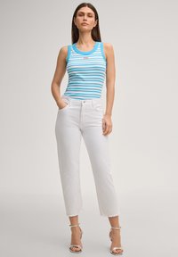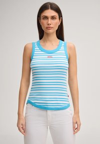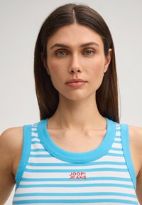 Vrouw draagt een blauw-wit gestreept mouwloos shirt met de tekst "JOOP! JEANS", gecombineerd met witte broek, staand tegen een effen achtergrond.