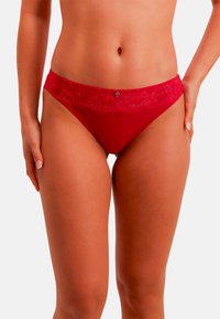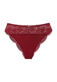Rode bikinislip gemaakt van zachte stof met een kanten tailleband. Het kant heeft een bloemmotief en een klein decoratief detail aan de voorkant.