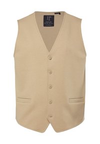 Bruine vest met vijf knopen, gecombineerd met een wit dress shirt en een grijs gestreepte stropdas. Handen in de zakken, waarmee een gestructureerde stof wordt getoond.