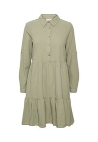 Lichtgroene katoenen jurk met een kraag, knoopsluiting aan de voorkant, driekwart mouwen en een tiered ruffled zoom.