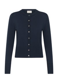 Bordeaux cardigan met lange mouwen, ronde halslijn en zilverkleurige knoopdetails aan de voorkant. Zachte gebreide stof, aansluitend design.