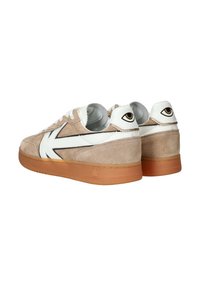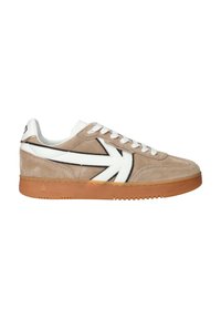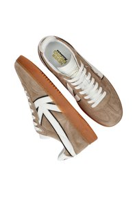 Beige suède sneakers met witte accenten, zwarte details en een gumrubberen zool. Voorzien van een ronde neus en platte witte veters.
