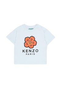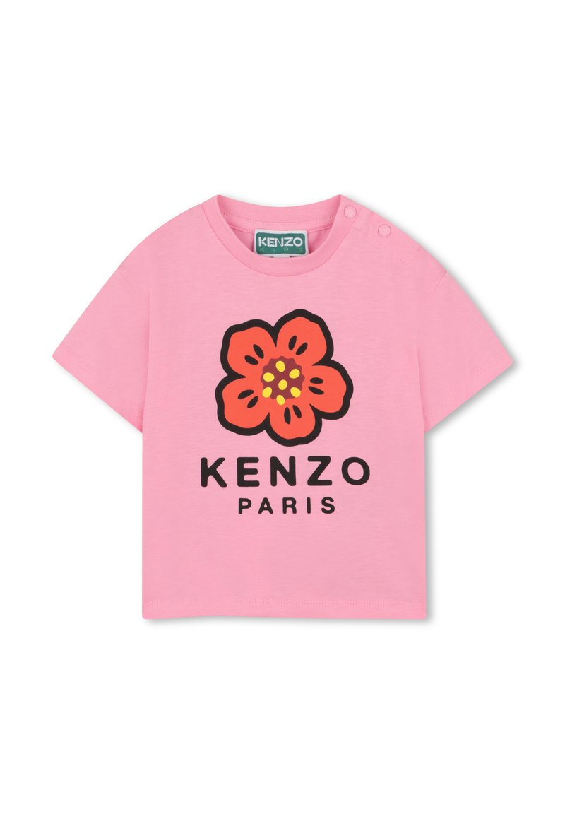 Roze peuter-T-shirt met een grote oranje bloemopdruk en de tekst "KENZO PARIS" aan de voorkant, met drukknoopjes op de schouder.