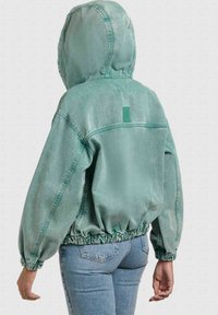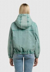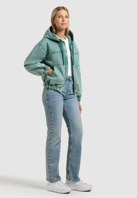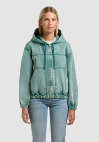 Jonge vrouw die een teal gekleurde capuchontrui met ritssluiting, trekkoorden en zakken aan de voorkant draagt, gecombineerd met lichtblauwe spijkerbroek, staande tegen een effen achtergrond.