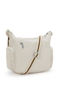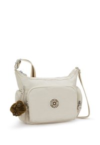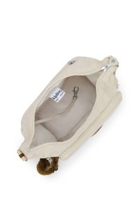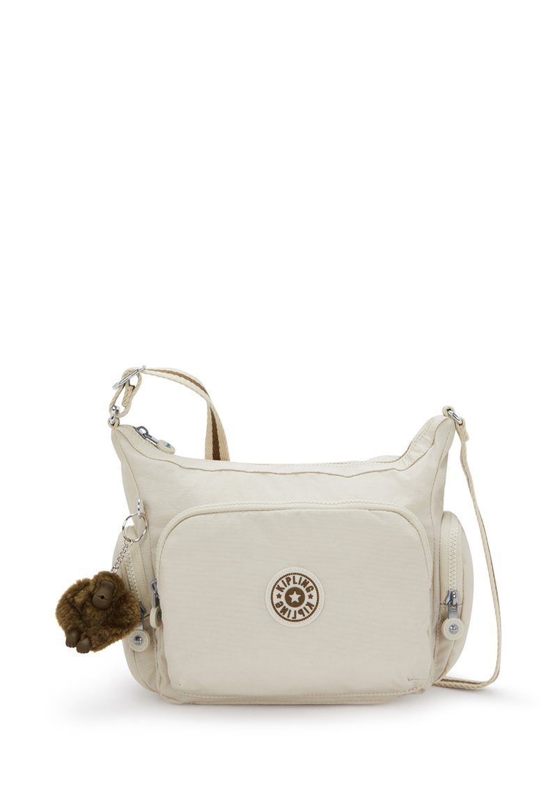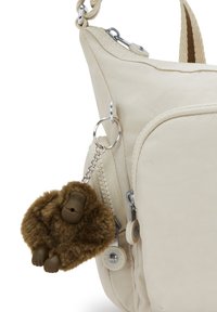 Beige schoudertas van zacht stof, met een voorvak met rits, een merklogo en een pluizige sleutelhanger in de vorm van een aap.