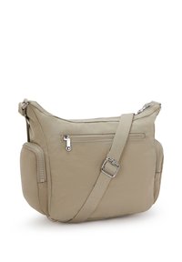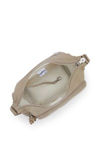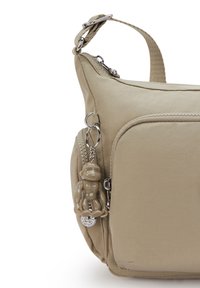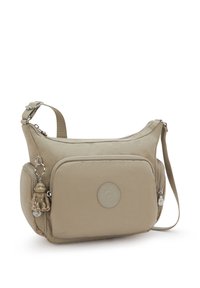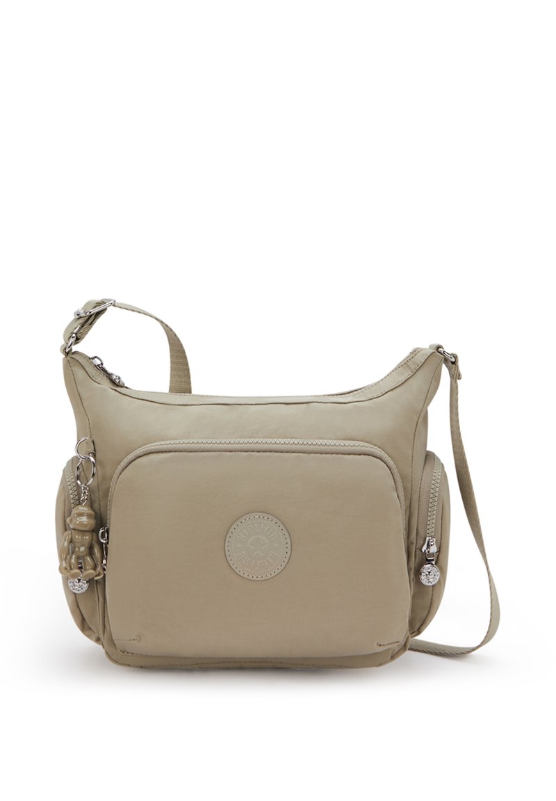Beige schoudertas met een voorvak, verstelbare riem, zijritsen en een kleine sleutelhanger in de vorm van een aapje bevestigd aan een ritssluiting.
