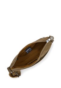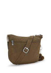 Bruine stoffen crossbodytas met een voorzak met rits, verstelbare band en een aangehechte zachte apensleutelhanger op een witte achtergrond.
