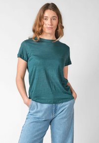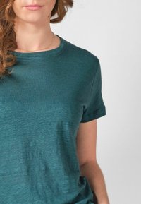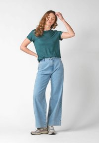 Jonge vrouw met golvend bruin haar, een teal kortemouwen shirt en lichtblauwe jeans met hoge taille, staand met handen in de zakken.