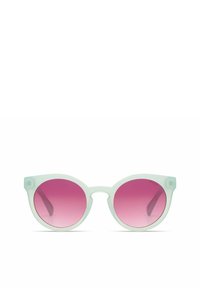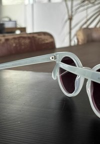 Ronde zonnebrillen met een doorschijnend lichtblauw montuur en paarse gradient lenzen. Met soepele randen en flexibele pootjes.
