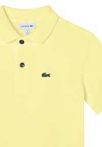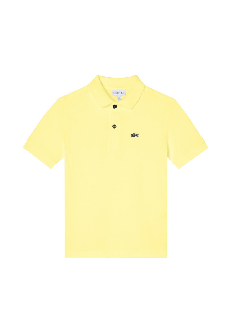 Gele poloshirt van katoen, met een klassieke kraag, korte mouwen, twee zwarte knopen en een klein groen krokodillenlogo op de borst.