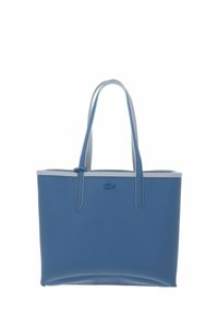 Lichtblauwe draagtas met dubbele handvatten en een kleinere, afneembare blauwe pouch aan de voorkant, beide gemaakt van gestructureerd materiaal.
